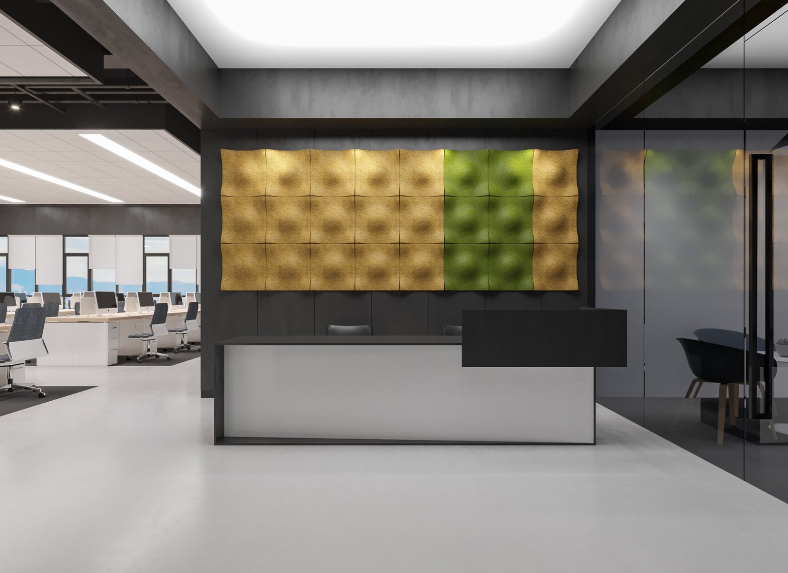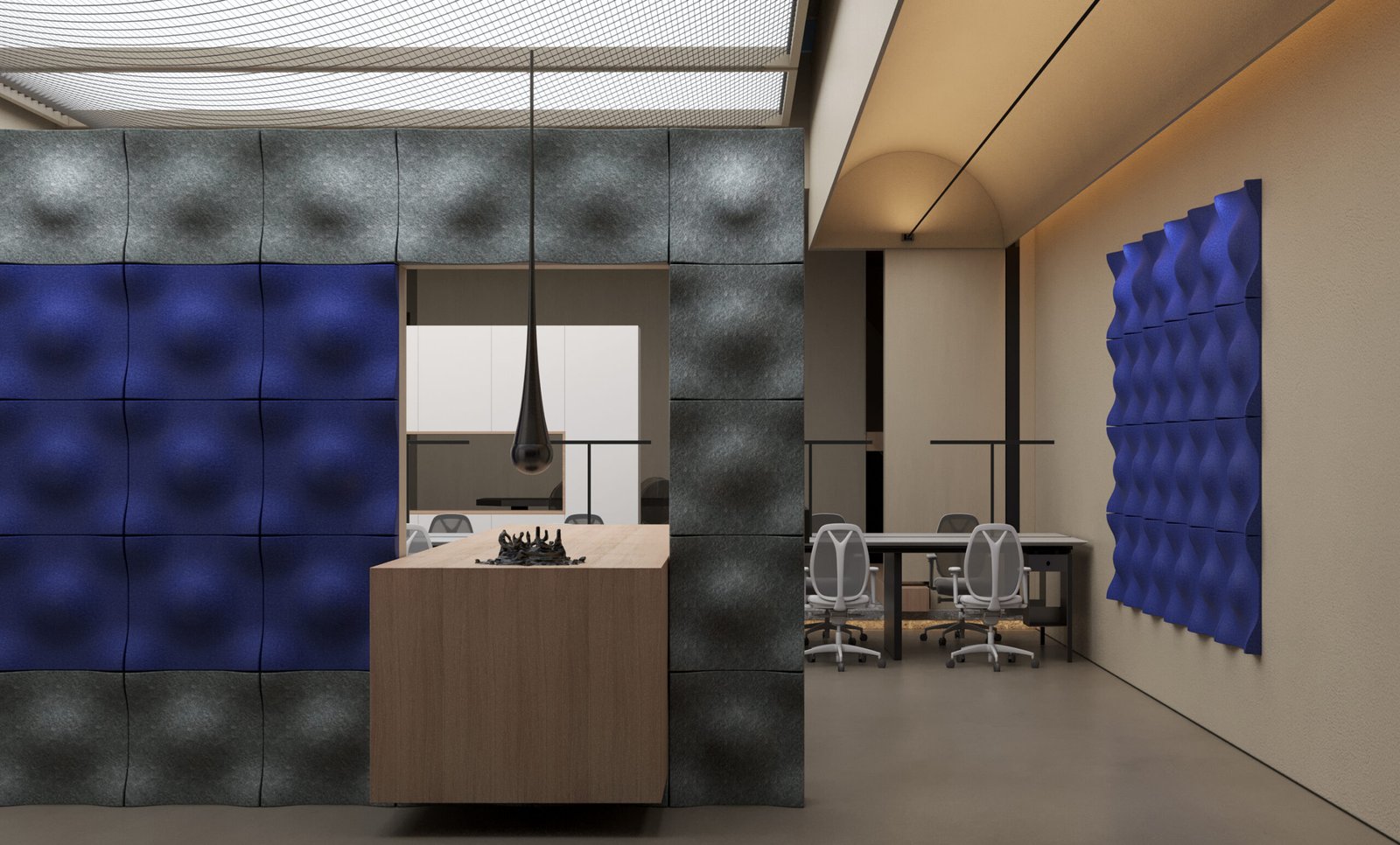 The Acustik acoustic fabric Gap Island office lamp is an acoustic luminaire in large size. Its large surface panel is suitable for open-plan offices or conference rooms. It absorbs a significant amount of the surrounding sound. The full panel creates an eye-catching feature in the space. Panel sizes and colors are fully customizable