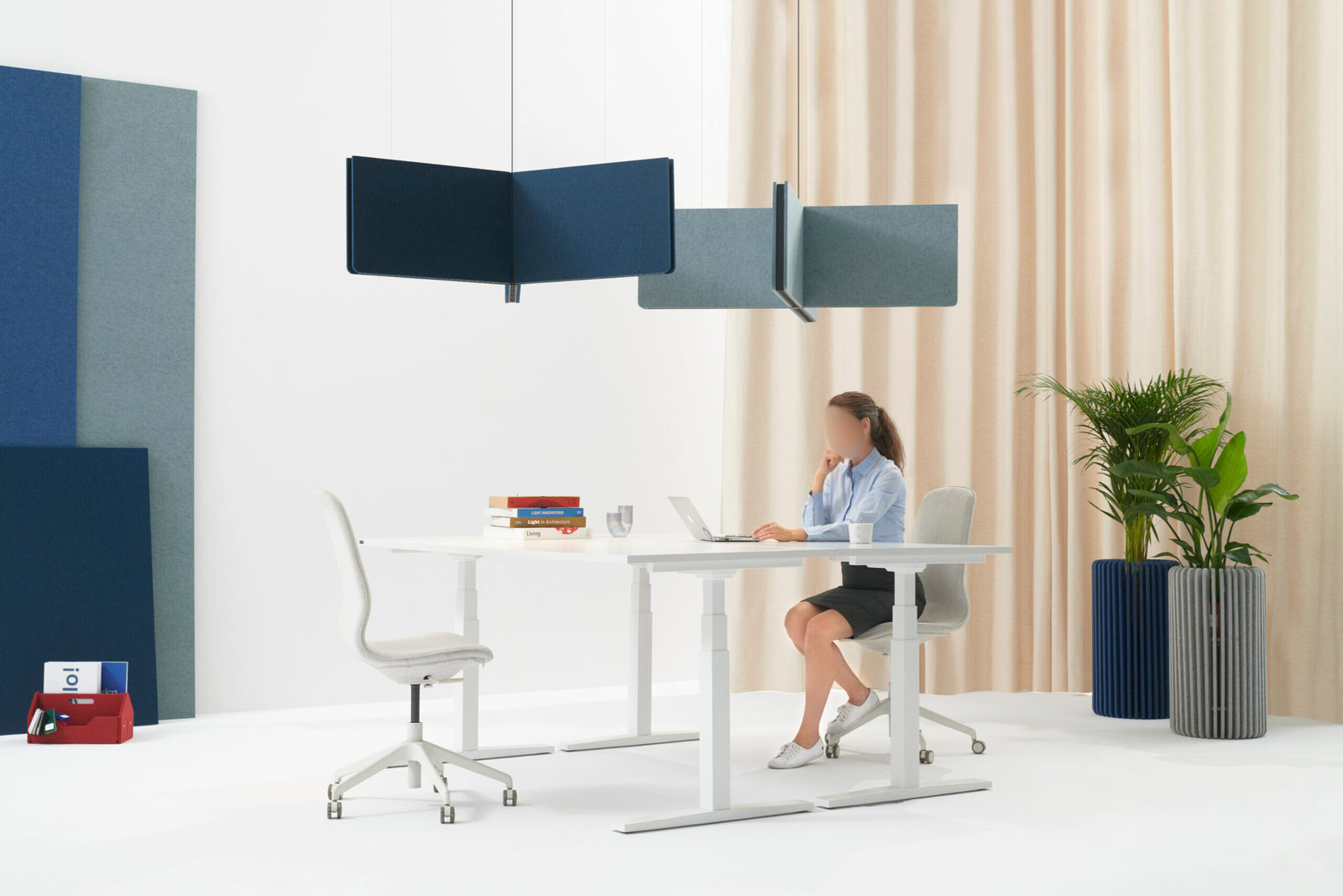 Blade X is an acoustic luminaire belonging to the Blade family with excellent sound absorption properties. Its X-shaped design, which includes four PET panels, effectively absorbs ambient noise. In addition, it can act as a partial barrier in open-space offices. Using high-quality light sources, the luminaire can also act as lighting for multiple workstations. Its advanced design, focusing on effective sound attenuation and providing adequate illumination levels, makes it a versatile tool for improving the quality of work and the comfort of employees.