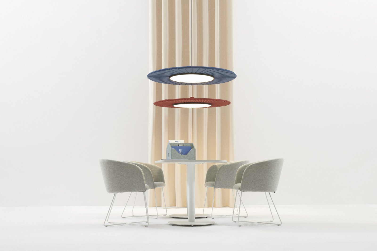 Easy Round acoustic lamp is a functional and versatile lighting solution designed specifically for office environments. Its design emphasizes simplicity and functionality while addressing both lighting and noise absorption needs. The lamp’s construction comprises two PET panels, which contribute to its thickness and help reduce ambient noise in the office environment. By absorbing sound waves, the lamp assists in creating a quieter and more conducive workspace. The high-quality lighting provided by the Easy Round lamp is a significant feature. One notable aspect of the lamp’s design is its flat horizontal structure. This design attribute allows the light to be distributed at a wide angle, which can effectively illuminate a larger area.