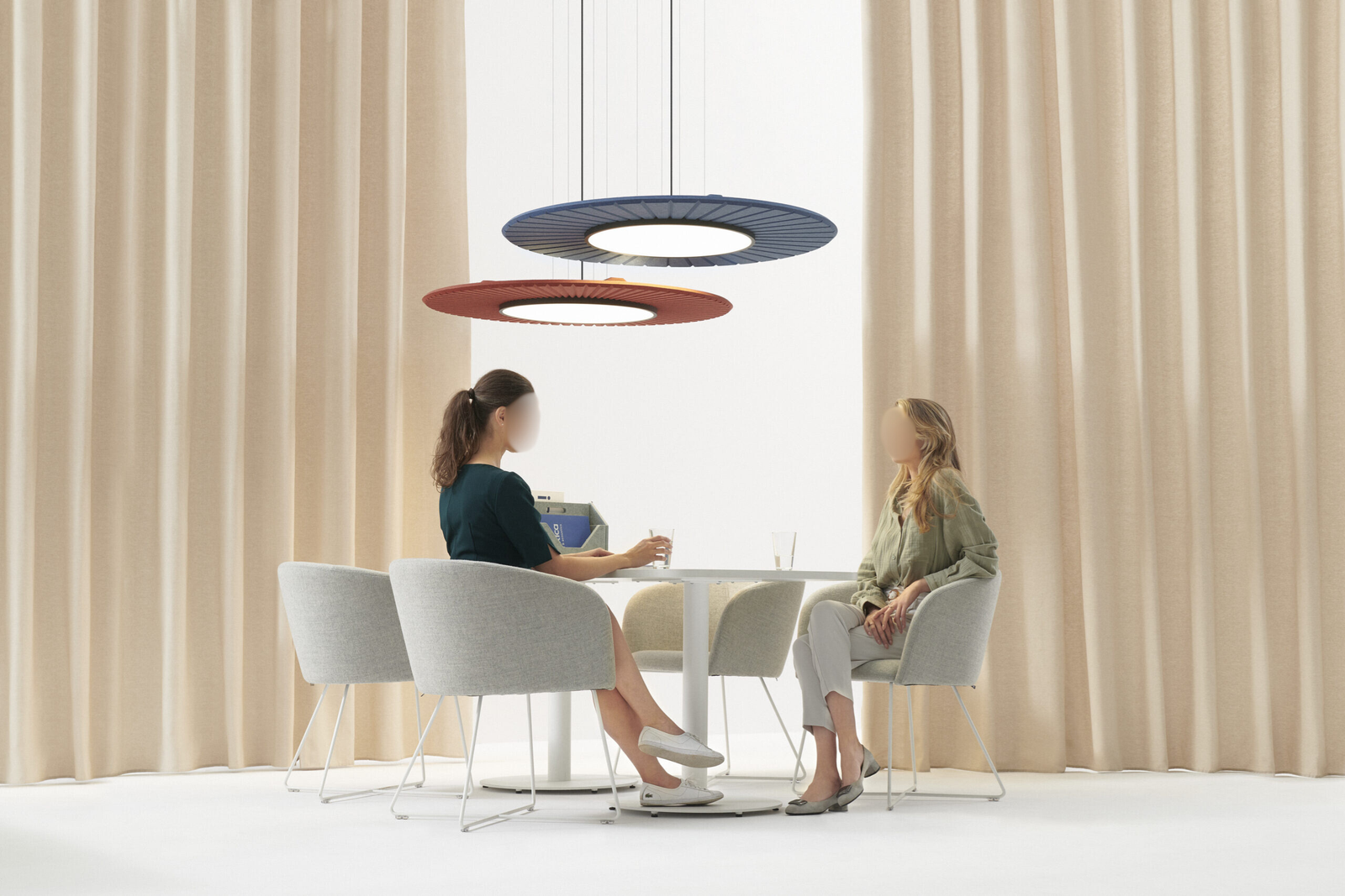 The design of the Gamma Round lamp emphasizes small individual ecoPET ribs that converge to create a circular structure, tapering at the top and widening towards the bottom, resulting in a broad light distribution angle. This design feature contributes to an improved acoustic comfort experience. Gamma Round provides effective lighting for open workspaces, utilizing adjustable brightness settings to meet the diverse needs of users. The lamp's circular shape enhances its ability to cast a uniform and encompassing light, creating an optimal environment for focus and collaboration. Integrated LED technology ensures energy efficiency, underscoring its dedication to reducing environmental impact.