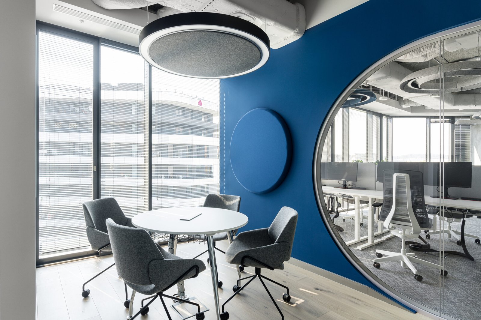 Easy Round acoustic lamp is a functional and versatile lighting solution designed specifically for office environments. Its design emphasizes simplicity and functionality while addressing both lighting and noise absorption needs. The lamp's construction comprises two PET panels, which contribute to its thickness and help reduce ambient noise in the office environment. By absorbing sound waves, the lamp assists in creating a quieter and more conducive workspace. The high-quality lighting provided by the Easy Round lamp is a significant feature. One notable aspect of the lamp's design is its flat horizontal structure. This design attribute allows the light to be distributed at a wide angle, which can effectively illuminate a larger area.