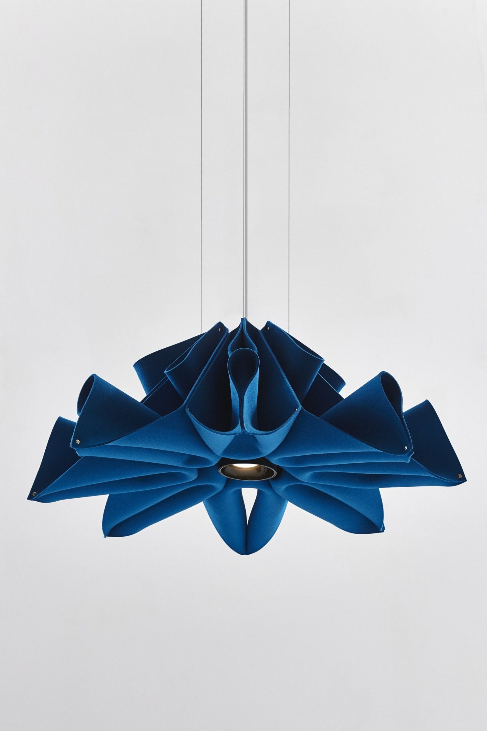 Rose is a pendant luminaire made from wool felt to achieve practical sound-absorbing qualities. The seemingly floating light source is discreetly integrated into the richly-textured felt shade to accomplish a unique contemporary feel. The luminaire contour exudes timeless aesthetics by pushing the felt material to the limit of its formability.