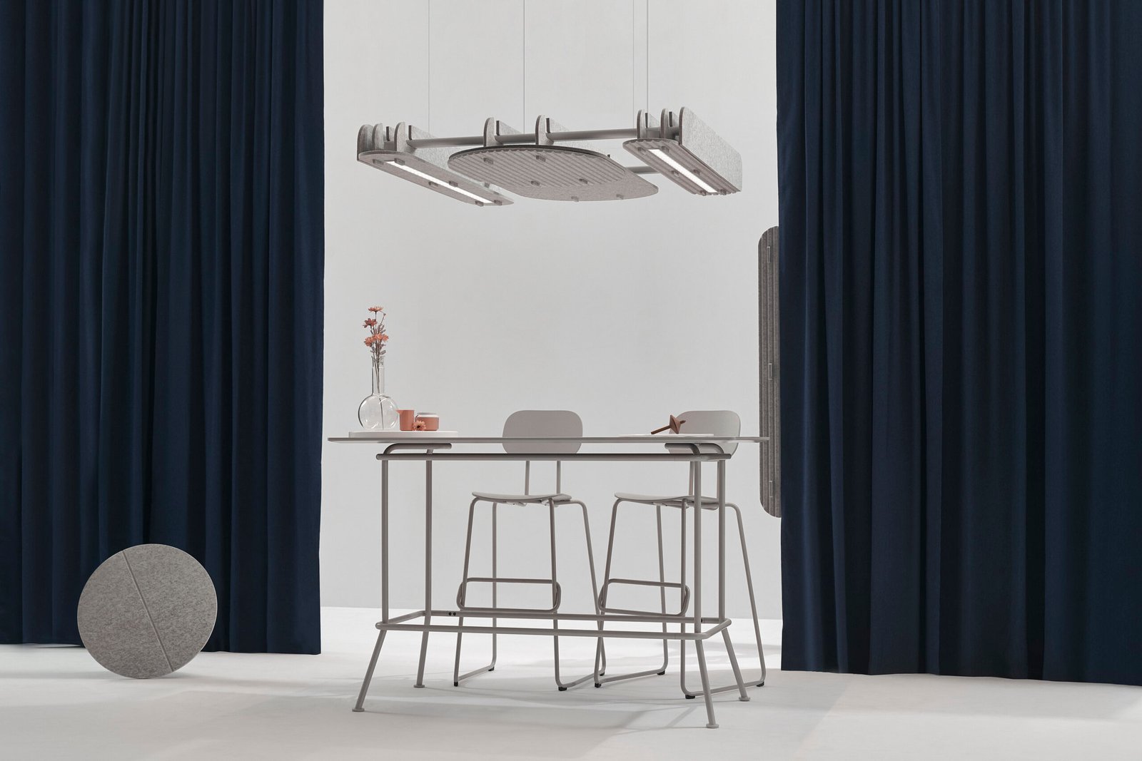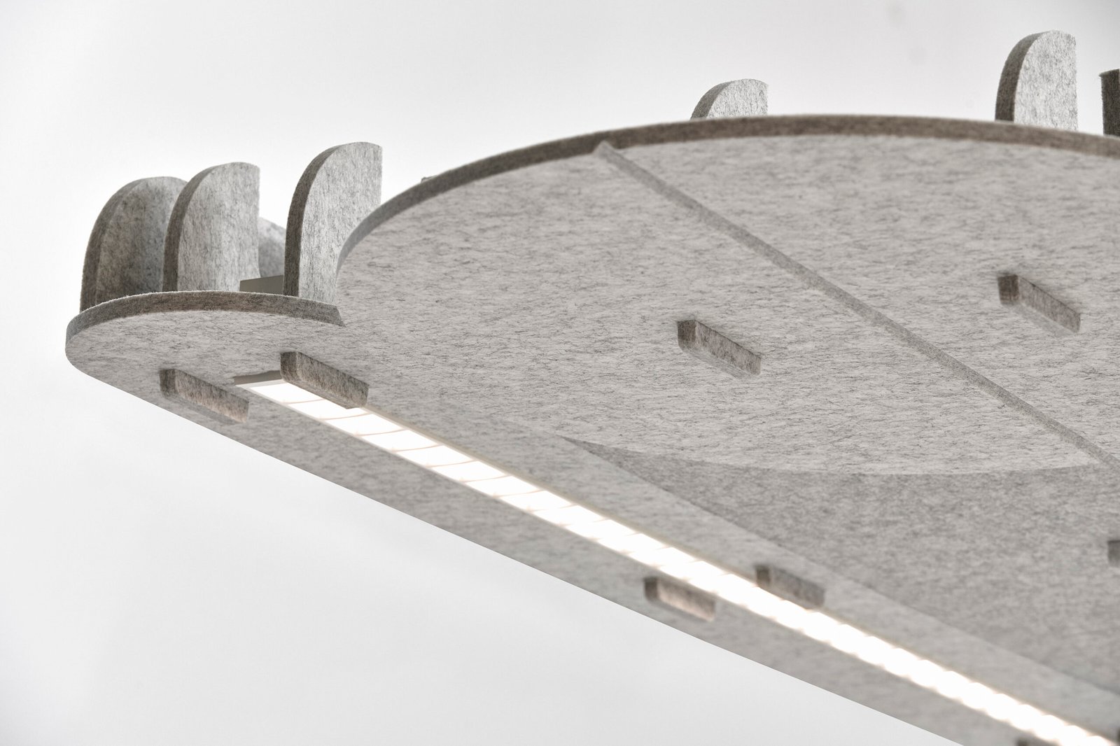 Acoustic Alpha is an oversized trapeze-shaped, highly effective office lamp made of sound-absorbing material from recycled PET bottles. The lamp design stands out with clean lines and a minimalist design. Alpha is made of sound-absorbing material made from recycled PET bottles, which is eco-friendly and helps reduce noise in the workplace. The Alpha luminaire provides bright and efficient lighting suitable for an office environment, with adjustable brightness settings to suit different needs. It uses LED technology to consume less energy and reduce environmental impact. The lamp is designed to be sturdy and durable, with a long lifespan and low maintenance requirements. The Alpha lamp can be controlled via a mobile app or remote control, allowing users to adjust the brightness and color temperature of the light to suit their needs.