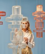 The luminaires from this line were inspired by classic, woven lampshades. Due to its size, each of the luminaires creates an intimate space. The lamp is filigree in detail and vast in size. The luminaire is based on two shades, external and internal. The whole is based on a welded structure made of powder-coated steel rods. Customers can choose from a luminaire in the shape of a circle or a rectangle with rounded corners.