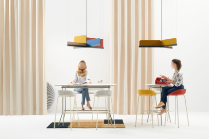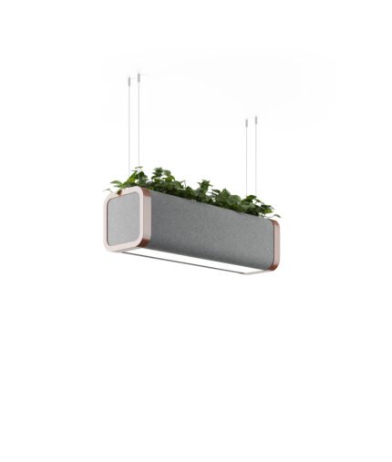 The hanging lamp with the pot, Acustik acoustic fabric Gaya was designed in the spirit of biophilic design. The lamp consists of two acoustic panels, a light component, and an inner shield shaped like a plant pot to plant anything. The luminaire not only perfectly illuminates the workplace but also enhances the visual value of the interior and gives it a classy character. The color of all the components of the lamp is customizable.