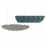 Hash is a suspended ceiling system designed to deliver efficient sound damping. Consisting of 14 ecoPET large baffles arrange din a perpendicular manner, intersecting with each other, the end construction forms a checkered dome that extends from the ceiling. It can take the shape of either a circle or square, allowing air to circulate between the components for enhanced sound absorption. This pendant ceiling system was meticulouslycrafted to diminish sound levels in expansive office spaces andemanates a commanding presence, captivating observers withits dynamic allure.