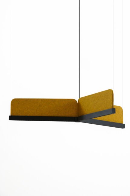 Horizon Y, an inventive acoustic lamp seamlessly integrating lighting and acoustics. This lamp employs a design centered around the Dot system, comprising three segments of the Line 28 profile equipped with advanced optics. These segments are artfully interconnected to form the distinct configuration of the letter "Y," facilitated by cylindrical "Dot" connectors. Adorning the upper arm of each profile lies a PET panel, which can be customized in various shapes and color palettes according to your preferences. What sets this lamp apart is its remarkable acoustic efficiency, achieved with a surprisingly modest employment of PET material during its construction. Horizon Y finds its perfect placement in environments such as offices, conference rooms, restaurants, or lobbies, where the challenge of excessive noise frequently arises.